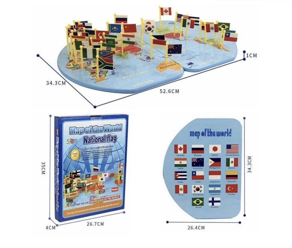 Harta are 2 fețe, pe una dintre ele sunt steagurile a 36 de țări, iar pe cealaltă harta lumii.