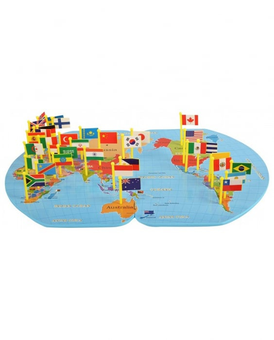 Acest minunat joc este de tip Montessori, promoveaza invatarea prin joaca si ajuta la dezvoltarea abilitatilor cognitive, motrice, dar si senzoriale. De asmenea, ajuta si la dezvoltarea memoriei celor mici, prin memorarea culorilor, a denumirilor tarilor, a locatiei acestora pe unul din cele 7 continente. Abilitatile motorii fine sunt dezvoltate prin necesitatea manevrarii steguletelor, prinderii acestora si a pozitionarii corecte pe harta.