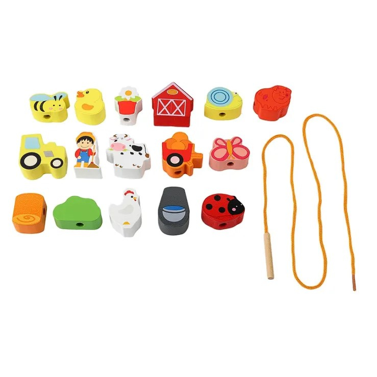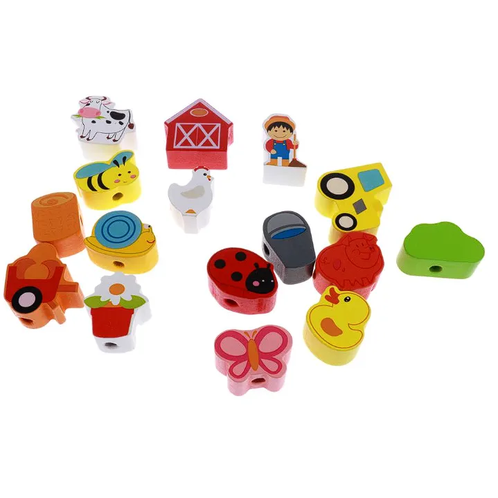 - 16 figurine groase din lemn cu animalute si alte obiecte de la ferma, prevazute cu orificii