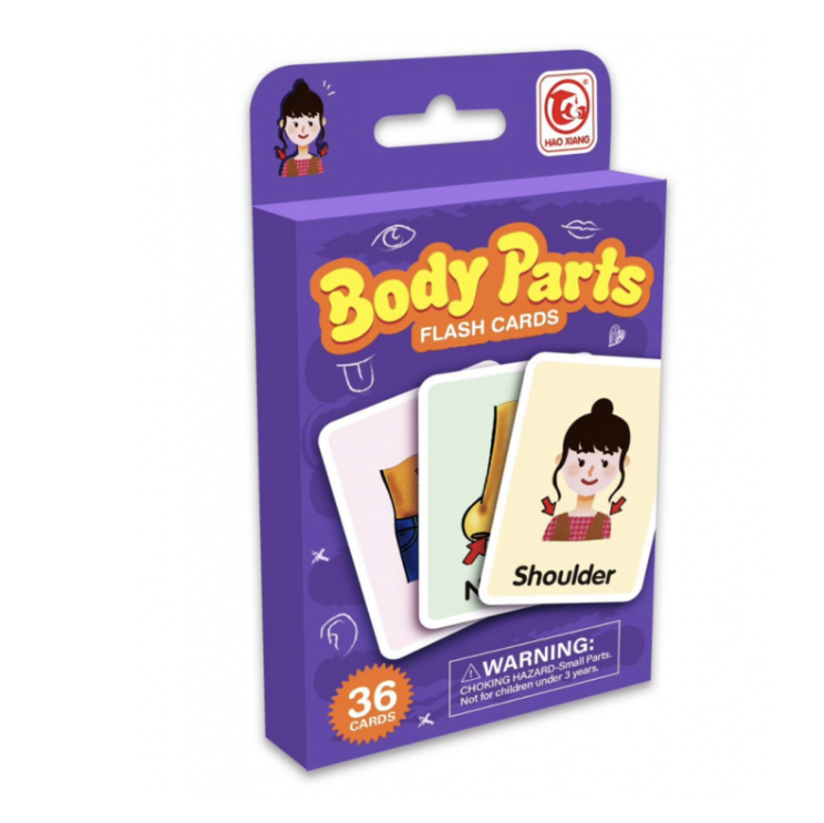 Cardurile flash educative sunt colorate și au imagini alb-negru pe verso. Fiecare card conține o parte a corpului în limba engleză.
