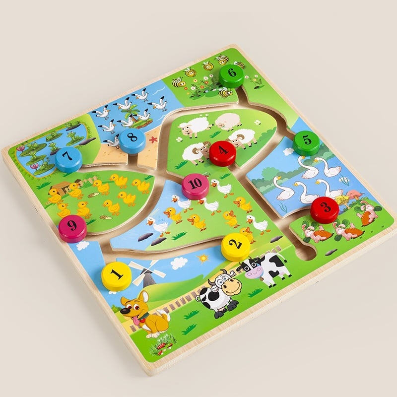 Joc educativ Labirint din lemn- Animale de la ferma si numere
