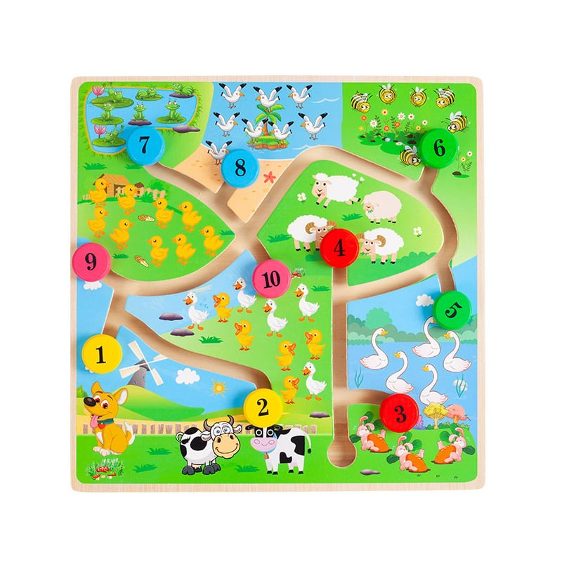 Acest labirint din lemn – Animale de la ferma si numere ofera o modalitate distractiva si educativa de a invata numerele si de a dezvolta coordonarea motorie fina. Copiii trebuie sa ghideze piesele colorate numerotate prin labirintul ilustrat cu animale de la ferma, urmand traseele pentru a potrivi corect fiecare numar. Jocul stimuleaza gandirea logica, concentrarea si recunoasterea vizuala a numerelor.