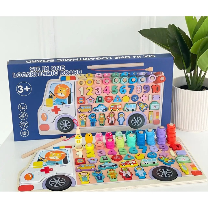 Aceasta tabla logaritmica din lemn este o jucarie educativa pentru dezvoltarea timpurie, cu functie de asociere si sortare. Pe langa sortare, acest joc are si cateva vehicule importante,dar si oameni corespunzatori meseriilor.