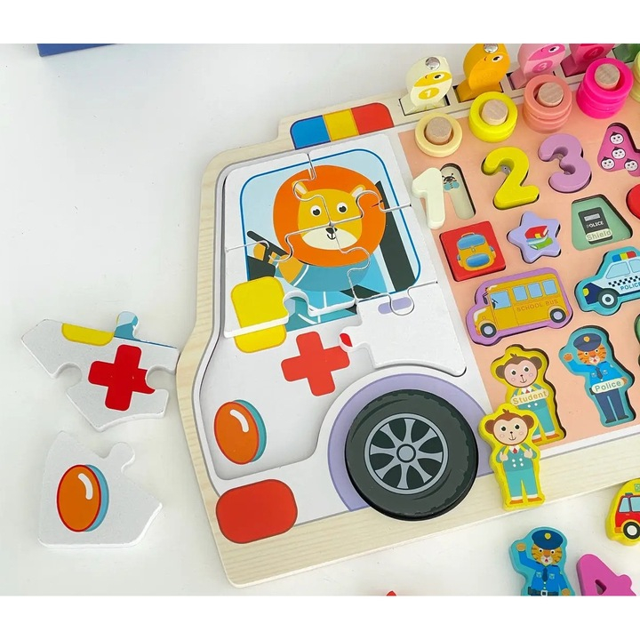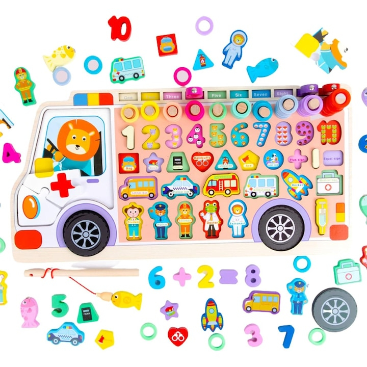 Numar de piese: Setul include cifre de la 1 la 10, diferite forme geometrice, figurine reprezentand salvatori si vehicule de urgenta, si o undita magnetica pentru jocul de pescuit.