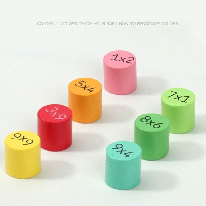 Fiecare piesa din lemn in forma de tub este fin lucrata, ceea ce asigura durabilitate si siguranta in timpul jocului. Piesele au imprimate pe fata operatiunea iar pe verso rezultatul. Fiecare sir de inmultiri este colorat diferit pentru a nu se incurca piesele intre ele.