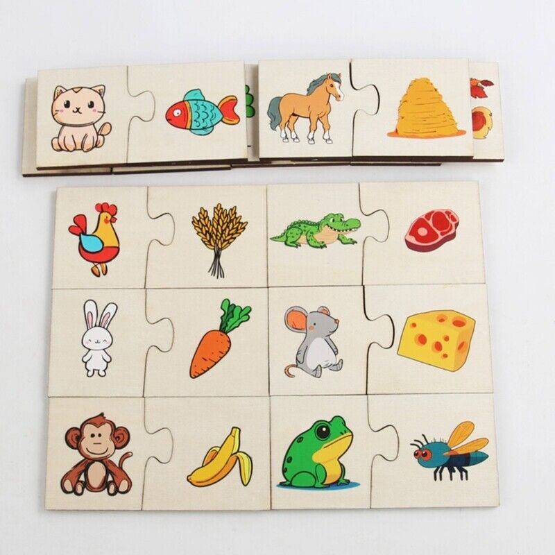 Puzzle din lemn pentru copii, alcatuit din piese care au ca tema asocierea intre animale si alimentele lor preferate sau caracteristice. Puzzle-ul este segmentat in patrate, fiecare formate din doua piese care, odata unite, formeaza un tablou complet cu un animal si mancarea sa asociata. Piesele puzzle-ului ilustreaza o varietate de elemente naturale si animale.
