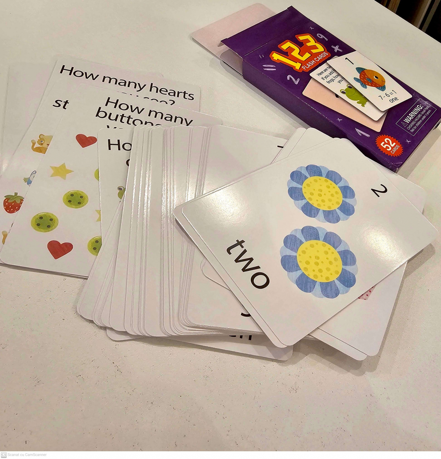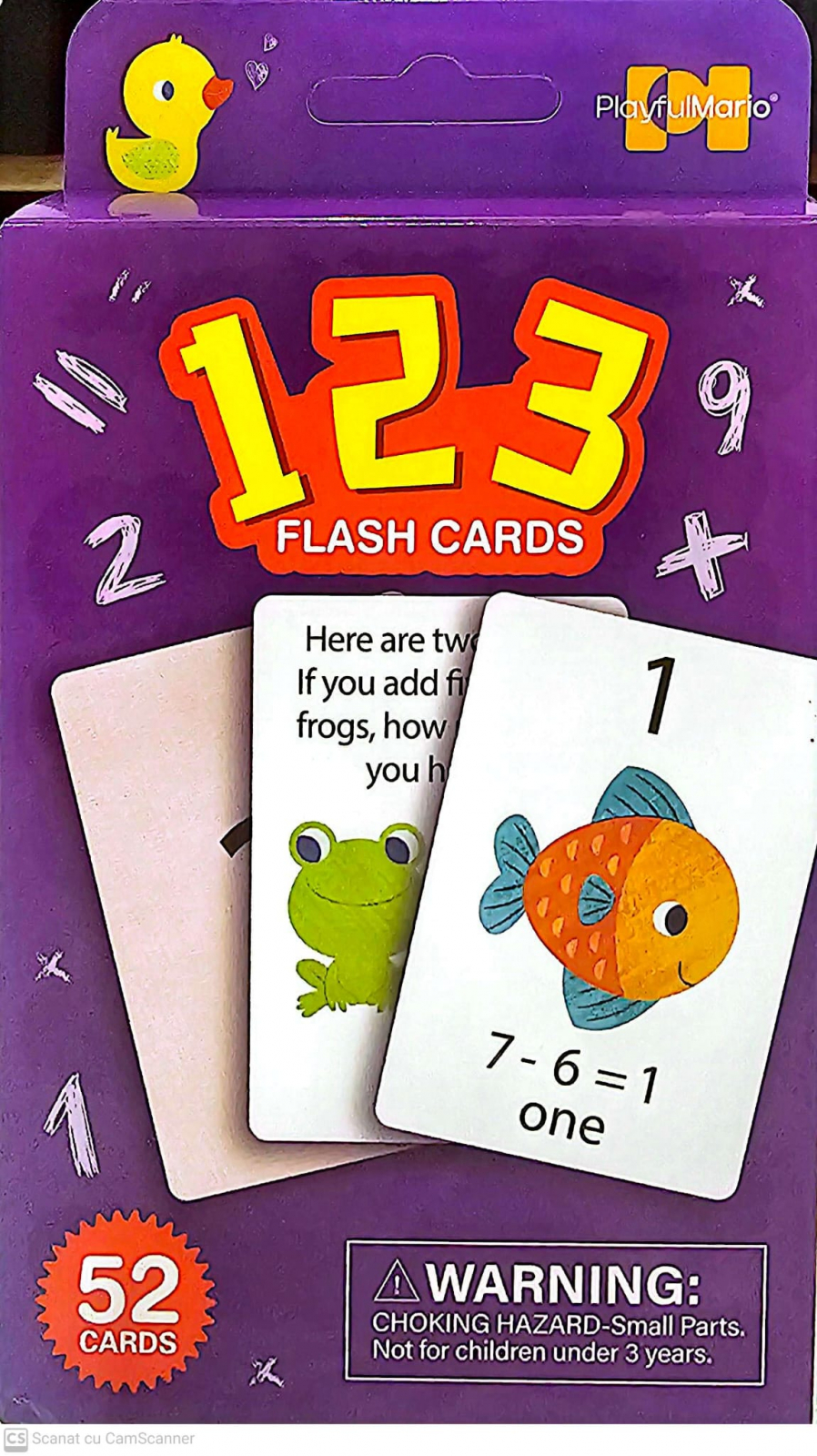 Acest set conține 52de carduri din carton cu cifre, semne aritmetice, calcule matematice, întrebări și exerciții de matematică, de dificultate diferită, în limba engleză. Pot fi folosite inițial pentru a învăța cifrele, iar ulterior pentru a face exerciții simple și calcule matematice.