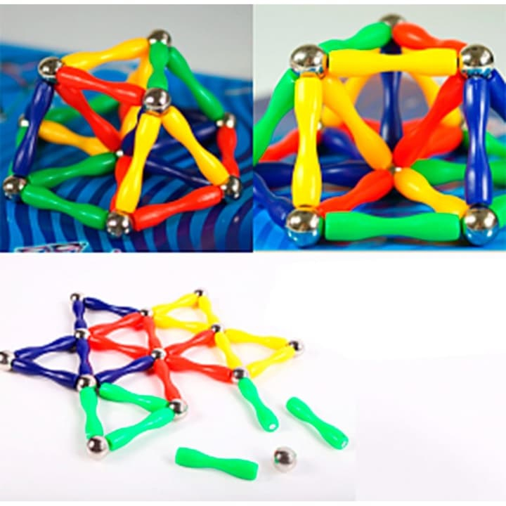 Setul contine 50 piese magnetice: 30 de tije colorate cu magneti in capete si 20 bile metalice.