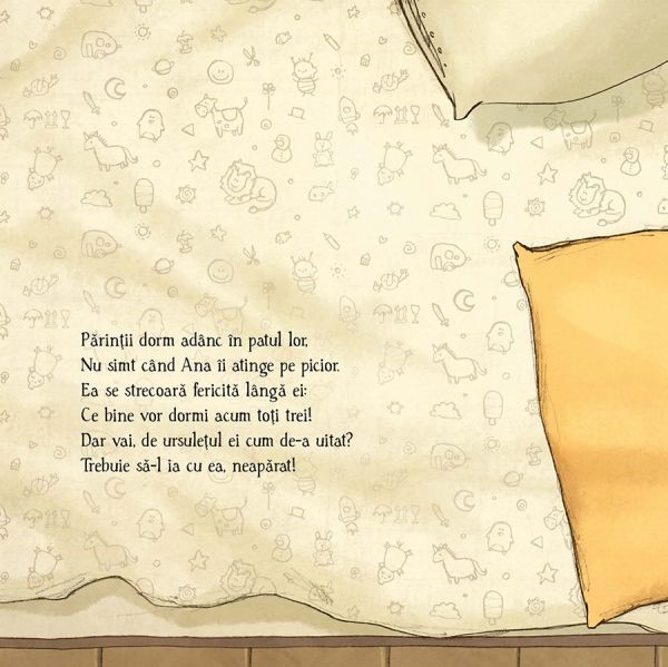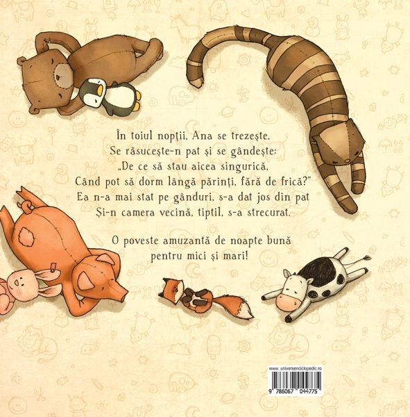 În toiul nopţii, Ana se trezeşte, Se răsuceşte-n pat şi se gândeşte: „De ce să stau aicea singurică, Când pot să dorm lângă părinţi, fără de frică?” Ea n-a mai stat pe gânduri, s-a dat jos din pat si-n camera vecină, tiptil, s-a strecurat. O poveste amuzantă de noapte bună pentru mici şi mari!